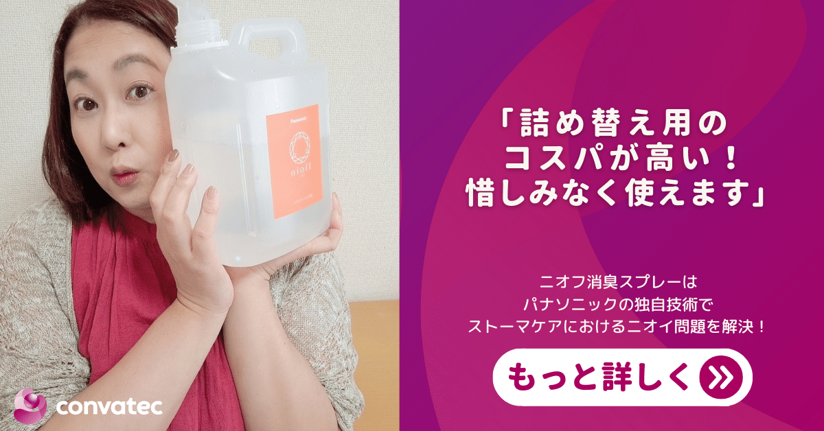私はコロストミーの固形の便なので、排出口についた便が拭き取りきれないときがあります。本来の使い方とは少し違うのですが、ニオフ消臭スプレーで濡らすことで、キレイにふき取ることができます。かつ、本来の消臭効果もあるので一石二鳥です。